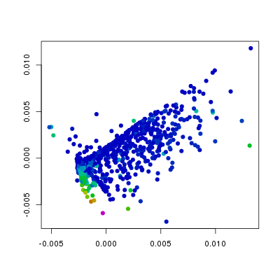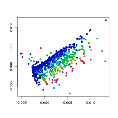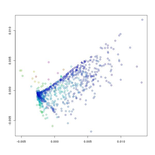 In the above plots I have changed the col and the pch arguments from the defaults. The col argument is set such that the colour indicates values in the different columns of f186, whereas the pch argument has been changed from the default 1 (open circles) to 19 (filled circles). From this we can see that the levels of Etv2 have the biggest influence on the position of points, and that the variation in Fli1 and Flk1 levels is orthogonal to that of Etv2. Furthermore, we can see, as we would expect that Pdgfra is expressed in a relatively small population of cells that do not express Etv2.