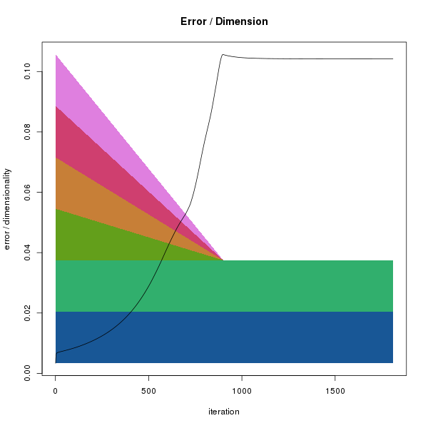 All methods give fairly similar arrangements and errors when the iteration numbers are reasonably high, and it's unclear as to what the preferred method should be. The parallel reduction is the default as it its results should be less influenced by the order of the columns. However the serial method gives a nice indication of the number of dimensions needed to fully represent the data.