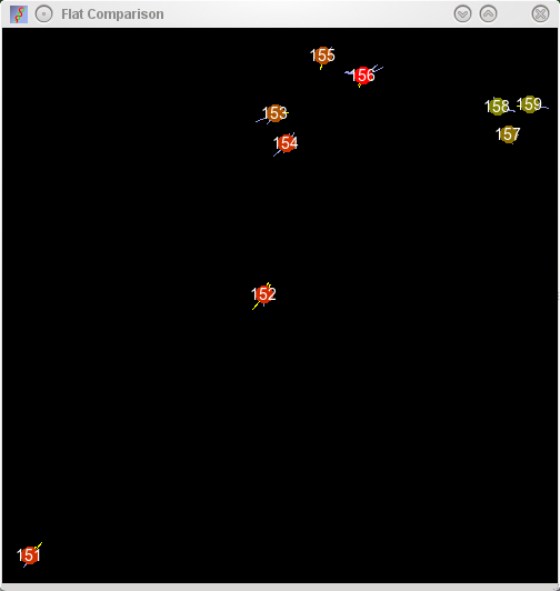 To start the transformation procedure, select the starting dimensionality, and the number of iterations to use (the larger the number of dimensions, the larger number of iterations should be used as these are split evenly across the dimensonalities), and press the start button in the 'new widget' shown in the above figure. Unless your computer is really slow just select the maximum number of iterations (10,000 at the moment, but I'm planning to increase this) and see how things go. Try with different number of dimensions and different reduction algorithms to see the effect. If you wish to have a record of the mapping procedure, you can right-click on the "Comparison" window and select Record on/off. This will prompt you for a directory location that will be filled with lots of Jpgs of the process. Let the mapping procedure finish before you try to doother things within the program (the actual mapping procedure runs in a separate thread, but the interacting drawing makes it difficult to use the program for other things during the mapping procedure. The procedure is finished when the blobs stop moving (or at least the forces stop changing). If there are many samples, then it is possible for samples to get caught in inappropriate areas by the repulsion of intermediate samples. If this happens, the caught samples will have very long yellow attractive lines pointing to other samples. The program allows you to drag these to a new position in the map and then to view the resulting forces and to continue the mapping procedure again (press 'Continue'). It is also possible to restart the mapping procedure from a different random seed by pressing the 'start' button again.