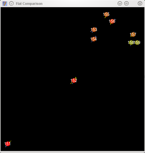 The experiment compare window lets the user perform two types of comparisons. One uses euclidean distances based on the expression data, whereas the other maps the data between 0 and 1 using a sigmoidal function (thus creating a sort of soft thresholding). The second of these seems to result in better groupings of samples, though it is not entirely clear why this is. It should be emphasised that these methods are quite simple, and that there are many ways of improving the calculated distances and if people are interested in doing this then let me know and we can discuss the issues that need to be tackled and how to implemement it in code (actually quite simple). For the flat comparison there are two parameters that can be changed, one the order of the sigmoid function and sigma, a value which changes the width of the function (I don't remember exactly off hand, but this may be described in more detail at later stages). Press the top 'Compare' button to start a normal comparison and the lower 'Compare' button to start a flattened comparison. A new widget will be inserted into the window when the comparison is finished. This contains controls for the process of mapping the points to a two-dimensional field using the distances obtained in the comparison.