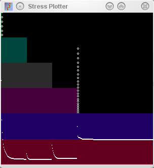 At present time the above described algorithm has been replaced by a somewhat smarter more complicated method. As should be obvious, the above description maps samples in an (N-1) dimensional space to coordinates in a a 2 dimensional space; and this reduction happens at the beginning of the mapping procedure when samples are assigned to random positions in a 2D field. Equally obvious should be the fact that there is nothing special about a 2D field except for the fact that the monitor is intrinsically a 2D display medium (one can also argue that vision is essentially 2D as we are not blessed with X-ray vision); hence the algorithm can be used to map into any number of dimensions. Since optimal arrangements are much more likely to be found in higher dimensional space I've changed the method, such that the initial dimensionality can be specified (Dim no.), and this dimensionality is then gradually reduced to two by one of three methods: