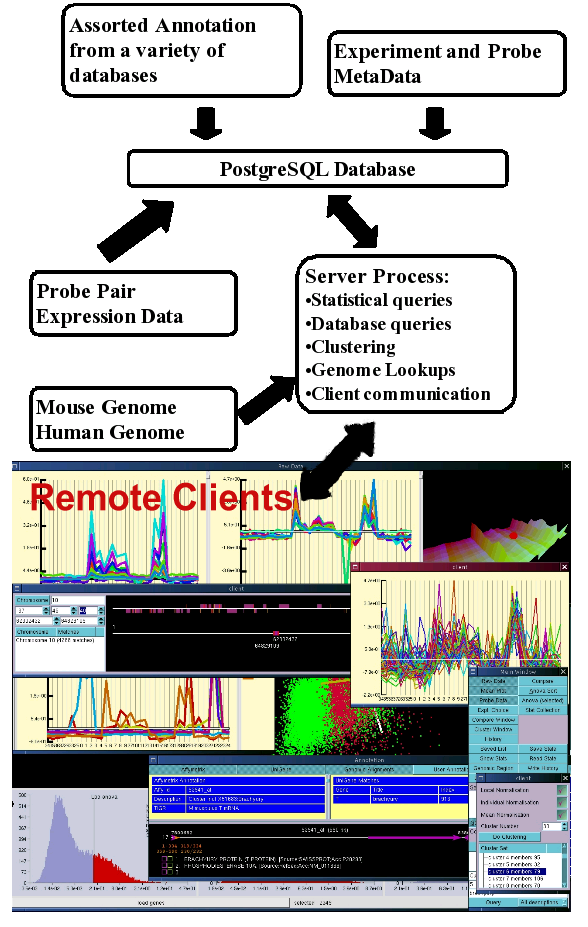 In order to allow many users to access microarray data quickly the system was designed as a client server system where the server maintains all the expression data along with associated information in memory. This server process communicates with an underlying database which it uses to make queries on associated data as well as to store user selections and annotation. The server process communicates with client applications which are used mainly as viewers and query (both statistical and database) input mechanisms. This means that users do not have to load large amounts of data into memory in order to perform analyses, and since the expression data is kept in memory, queries on the data can be performed very rapidly.